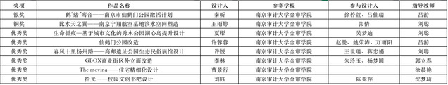 在本次比賽學生組共計收到368件作品,來自34所高校。我院2018級環境設計專業秦昕、呂佳瑞、徐若萱3位同學的作品《鶴“緒”鸾音——南京市仙鶴門公園激活計劃》從中突穎而出獲得銀獎,2017級環境設計專業王雨婷、張倩同學的作品《比水天之翼——南京甯翔航空墓地濱水空間塑造》獲銅獎,還有6件作品獲優秀獎。我校獲最佳組織獎、呂遊老師獲優秀指導教師獎。