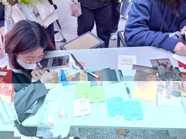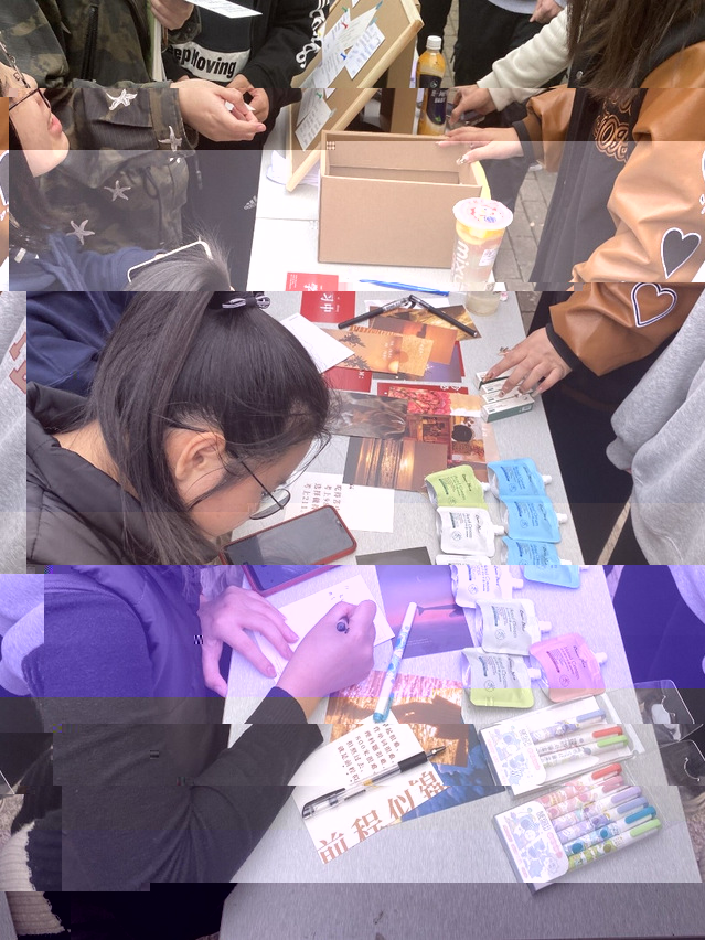 距離活動開始還有二十分鐘我們便等候在此了。桌子上擺滿了為大家準備的小禮物 護手霜、潤唇膏等。小小的明信片上承載着同學們的真心與真情。紅黃藍白,酸甜苦辣,大家認真寫下對未來、對現在、對自己、對他人的期許與祝福。伴随着心理工作站的成員們的聲聲“同學!” 的真摯邀請聲,參加活動的同學們越來越多。