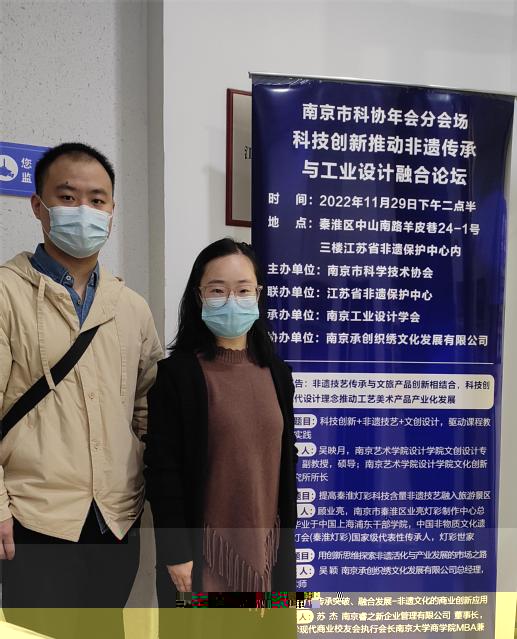 本次論壇由江蘇省文化和旅遊廳非遺處指導,江蘇省文化館、江蘇省非物質文化遺産保護中心主辦。邀請了南京藝術學院設計學院吳映月教授、國家級非物質文化遺産項目秦淮燈會國家級代表性傳承人顧業亮、南京承創織繡文化發展有限公司主理人吳穎、南京睿之新企業管理有限公司董事長蘇傑、江蘇翰港文化發展有限公司董事長祝康銘等,分别從非遺人才培養、非遺技術傳承及創新、非遺數字化運營等方面展開論壇報告。