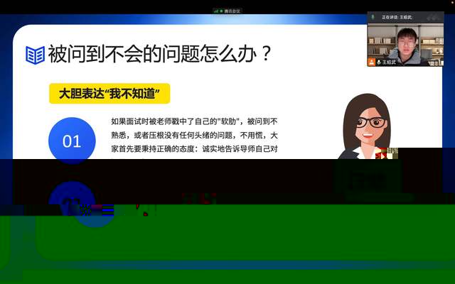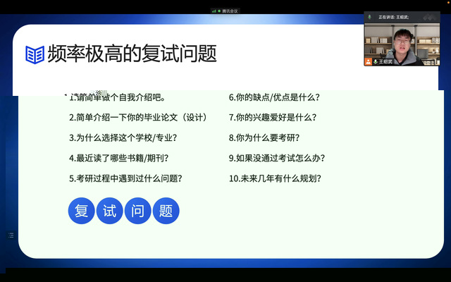 講座中,王紹武老師強調了複試過程中心态調整的重要性,還為學生們介紹了一些通用的回答問題的技巧,并在最後為一些有調劑需要的同學,提供了一些建議。引導同學們調劑前做好充分的心理準備及調研準備,調劑時“快”且“準”确保命中率。最後,在“Q&A”環節中,針對學生們的個例問題,王老師也給出了針對性的指導和溫馨的建議,殷切的期望每位同學都能成功上岸,金榜題名。