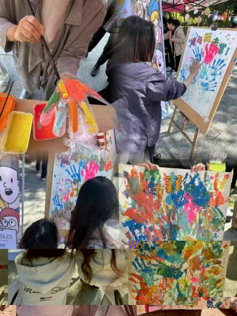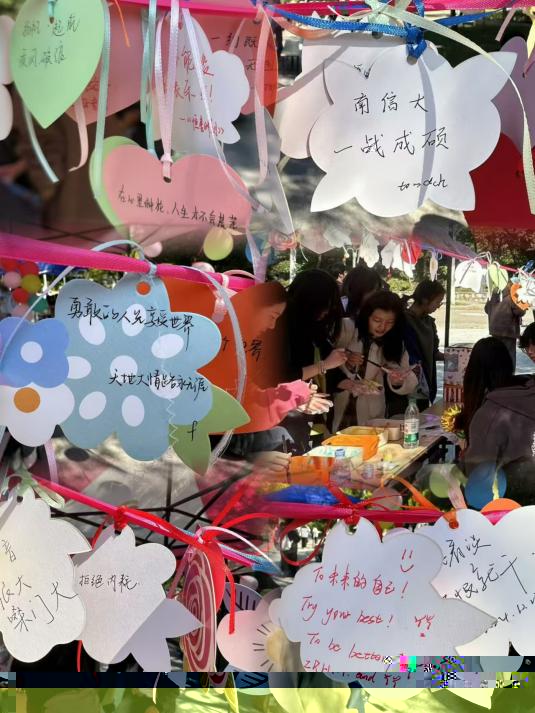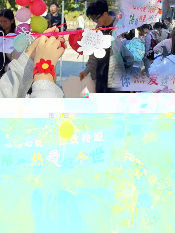 本次活動分為三個闆塊。首先,同學們在便簽上寫下束縛住自己的标簽,這些标簽或許是他人眼中的“我”,亦或者是我眼中的“我”;接着,同學們可以在“請與我擊掌”的海報上按下自己的手印,當無數個手印聚集在一起時,代表着有很多人在與你同行,給同學們帶來溫暖與力量;最後,同學們在挂牌上寫下自己的心願與熱愛,讓“愛”傳遞,讓“愛”轉運。